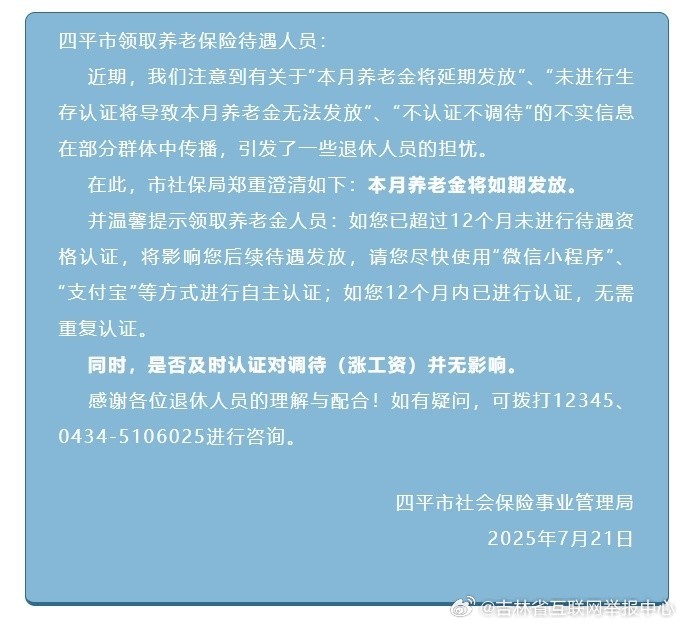 7月21日,吉林省四平市社会保险事业管理局发布澄清声明称,本月养老金将如期发放,是否及时认证对调待(涨工资)并无影响。同时,提示领取养老金人员:如已超过12个月未进行待遇资格认证,将影响后续待遇发放,请尽快使用“微信小程序”、“支付宝”等方式进行自主认证;如12个月内已进行认证,无需重复认证。